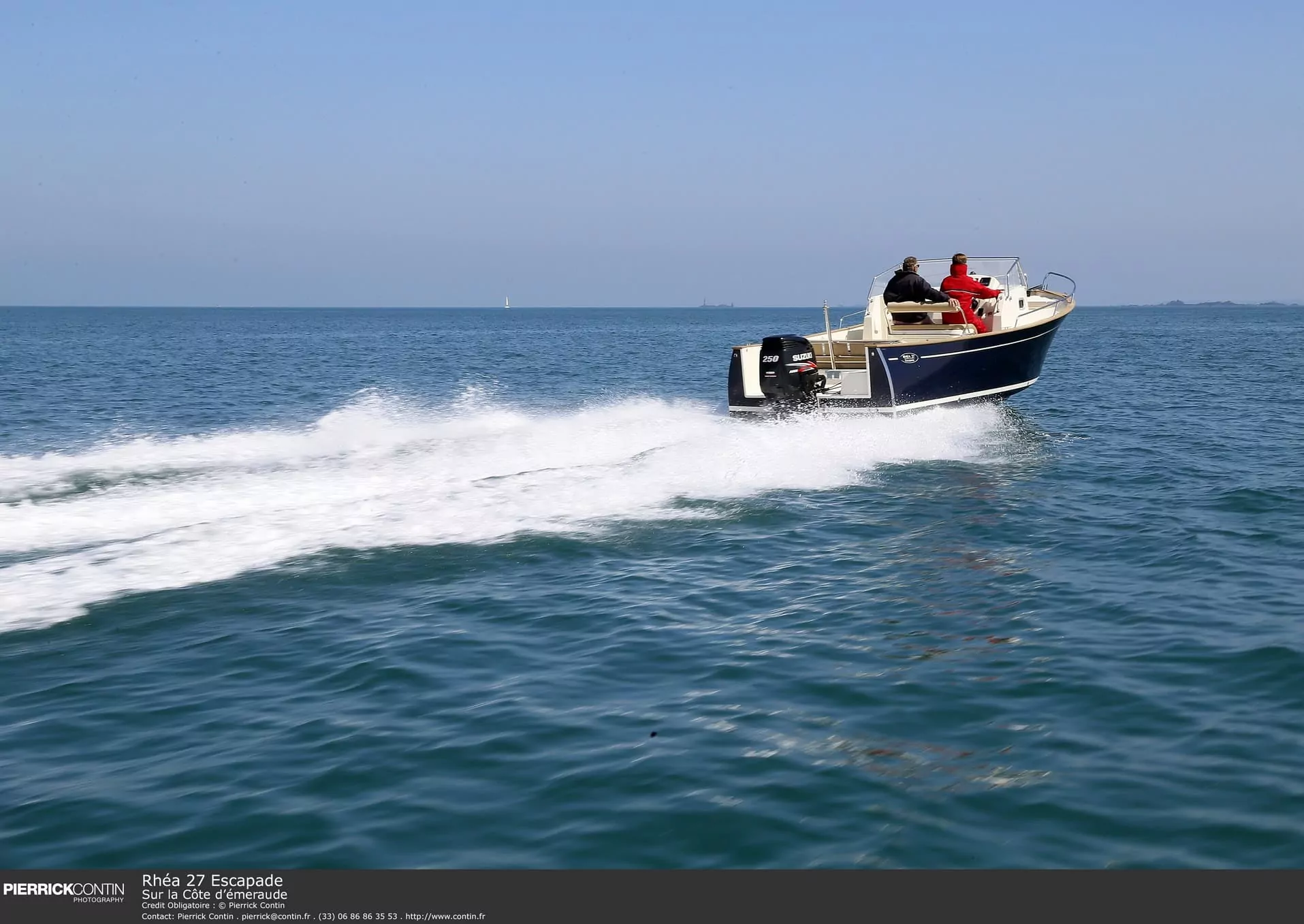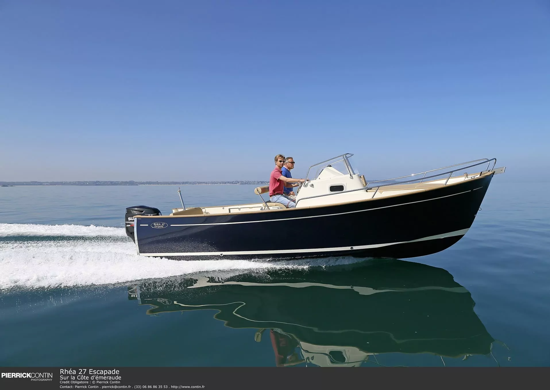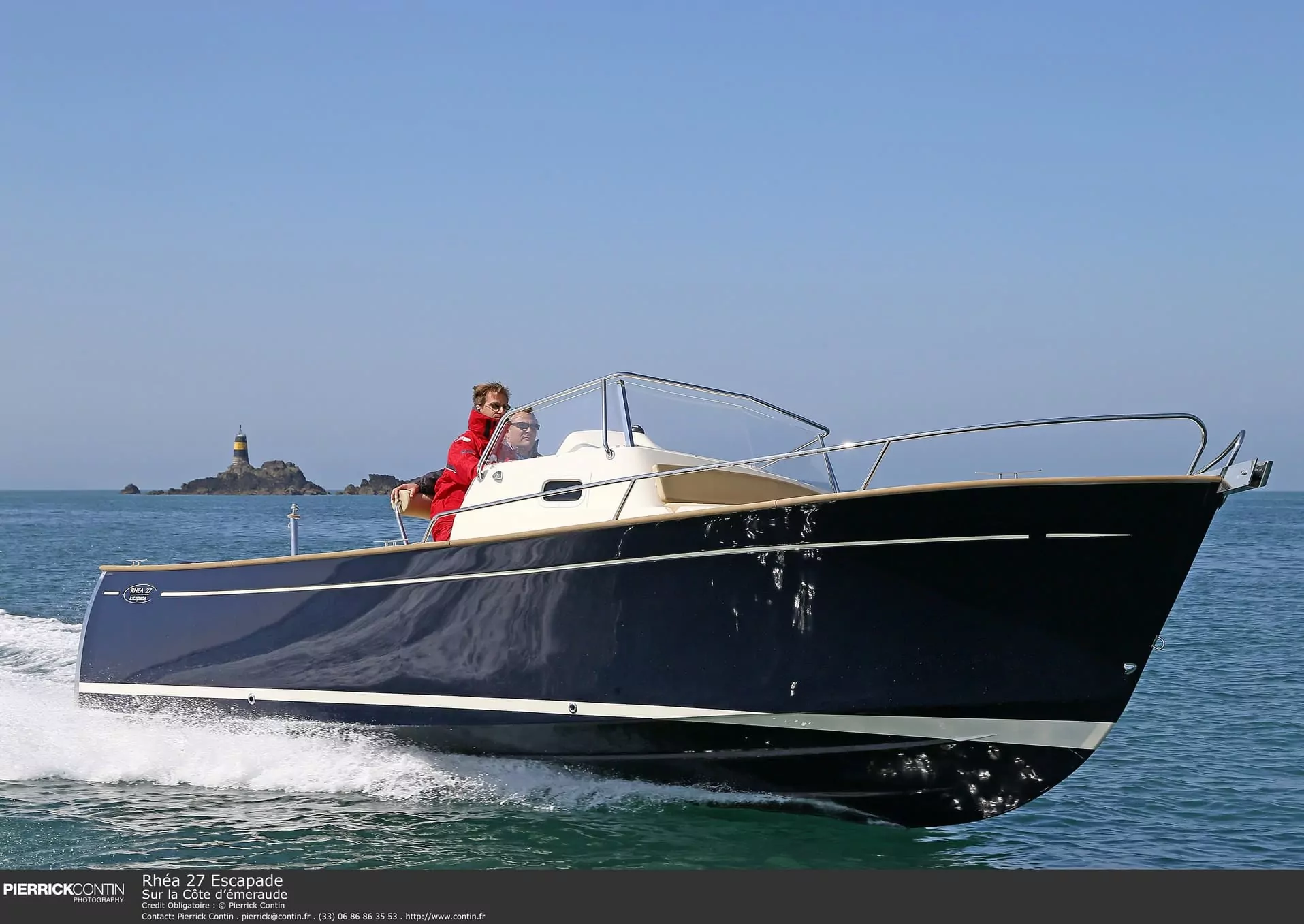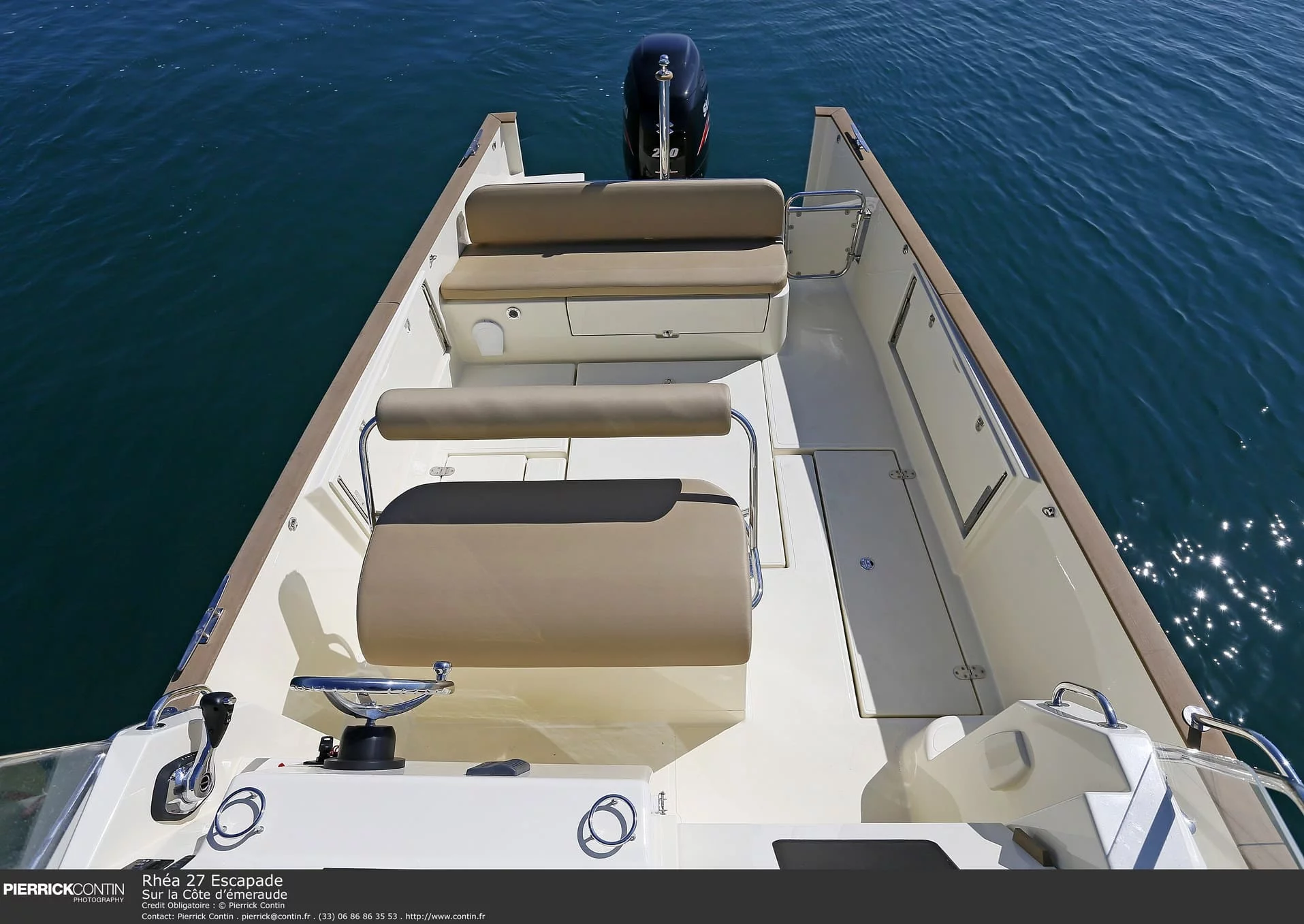 Le Rhéa 27 Escapade se prête à merveille aux navigations à la journée comme aux petites croisières, grâce à sa cabine équipée d’un lit double, d’une cuisine avec réfrigérateur et d’un cabinet de toilette digne de ce nom. La main courante inox autour du pare-brise et du siège pilote ajoutent à la sécurité du bord et à l’élégance du bateau.
