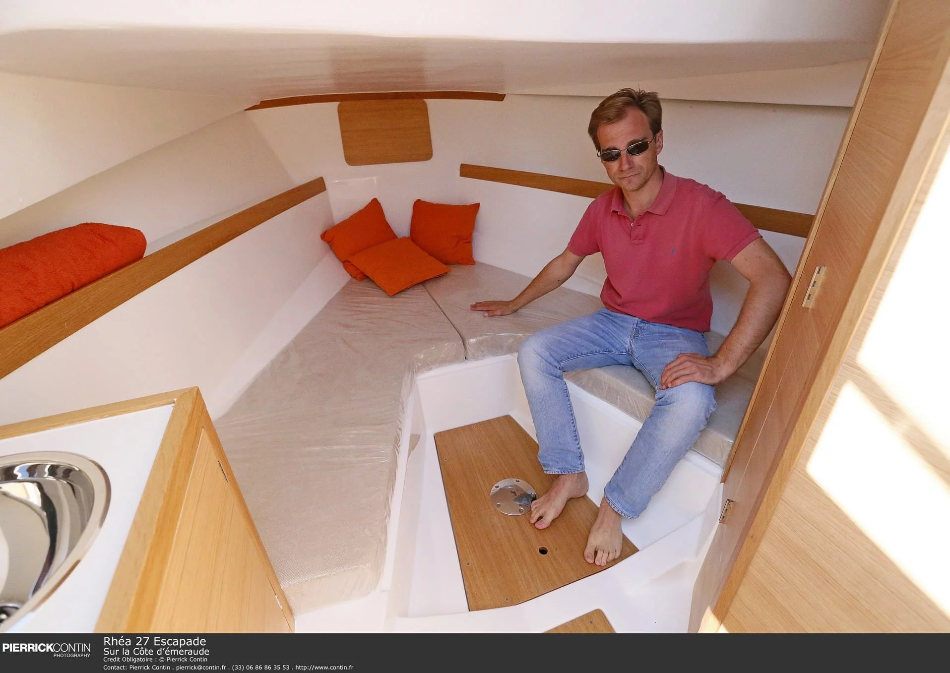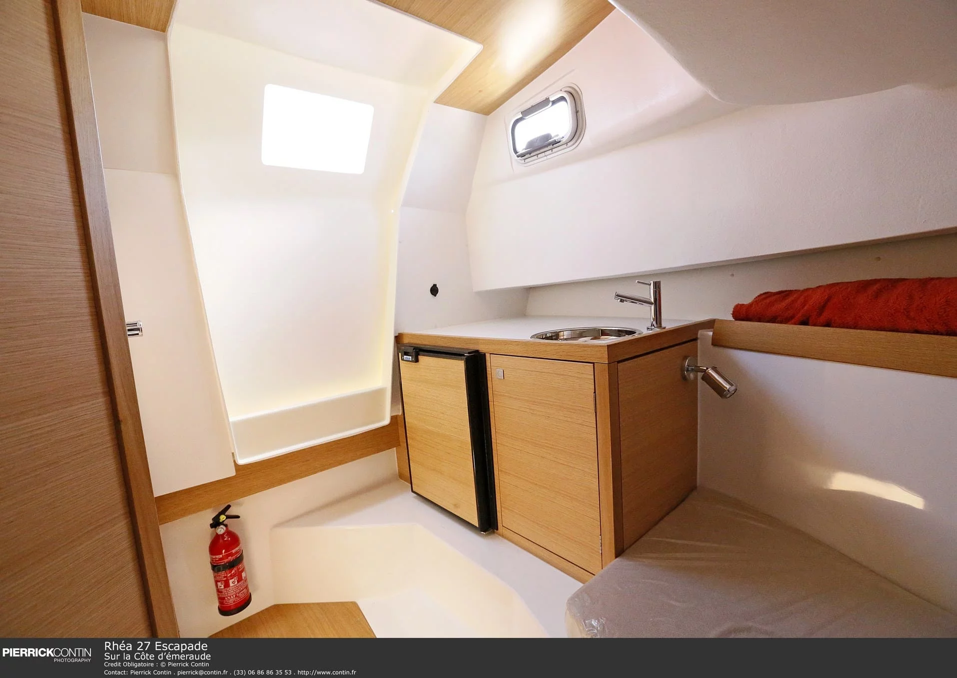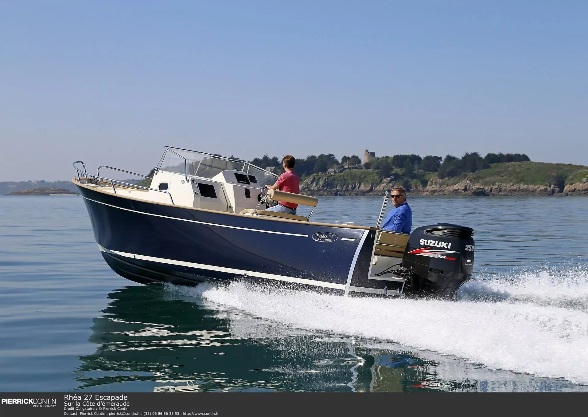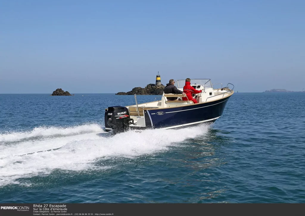 Le Rhéa 27 Escapade se prête à merveille aux navigations à la journée comme aux petites croisières, grâce à sa cabine équipée d’un lit double, d’une cuisine avec réfrigérateur et d’un cabinet de toilette digne de ce nom. La main courante inox autour du pare-brise et du siège pilote ajoutent à la sécurité du bord et à l’élégance du bateau.