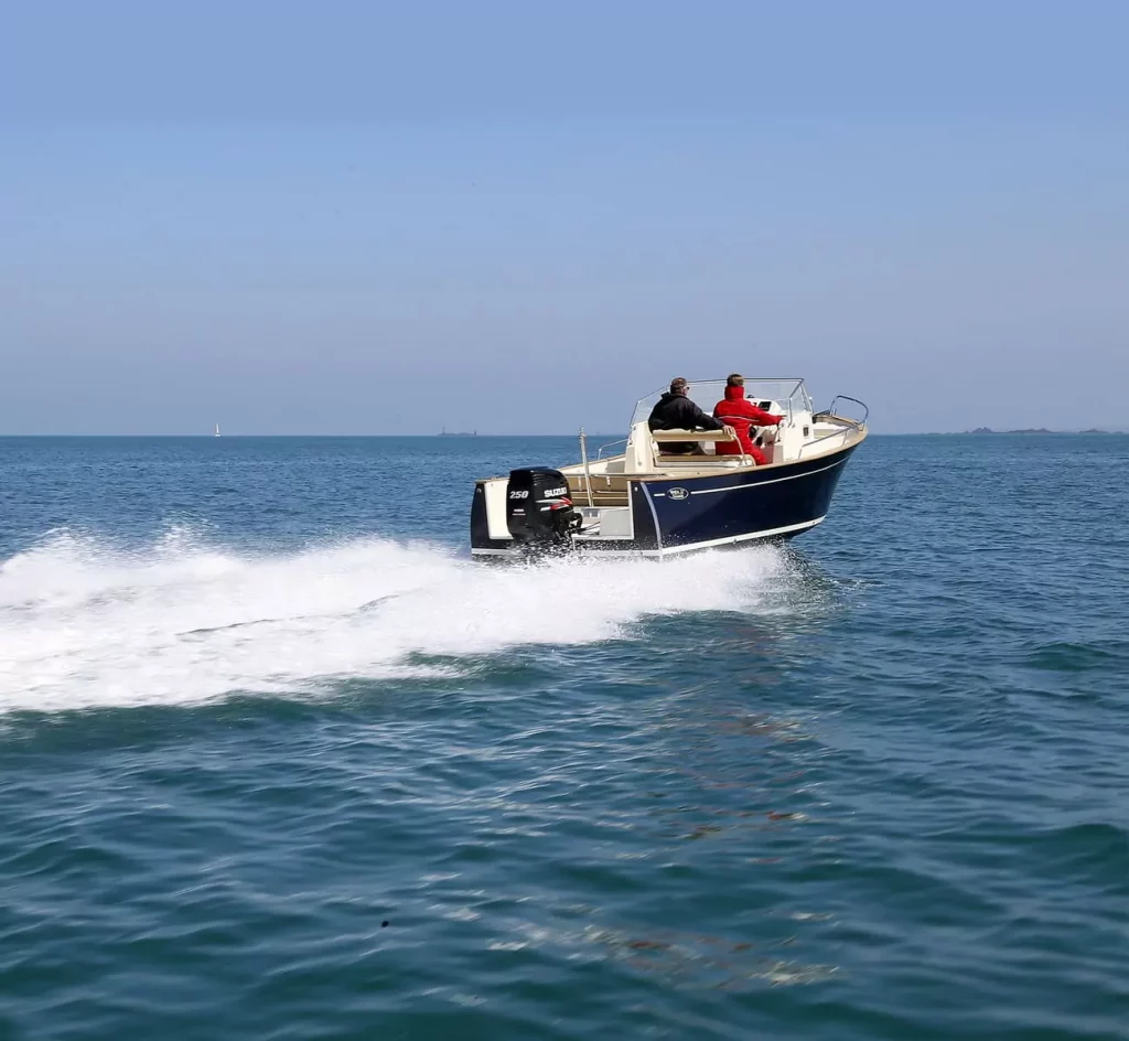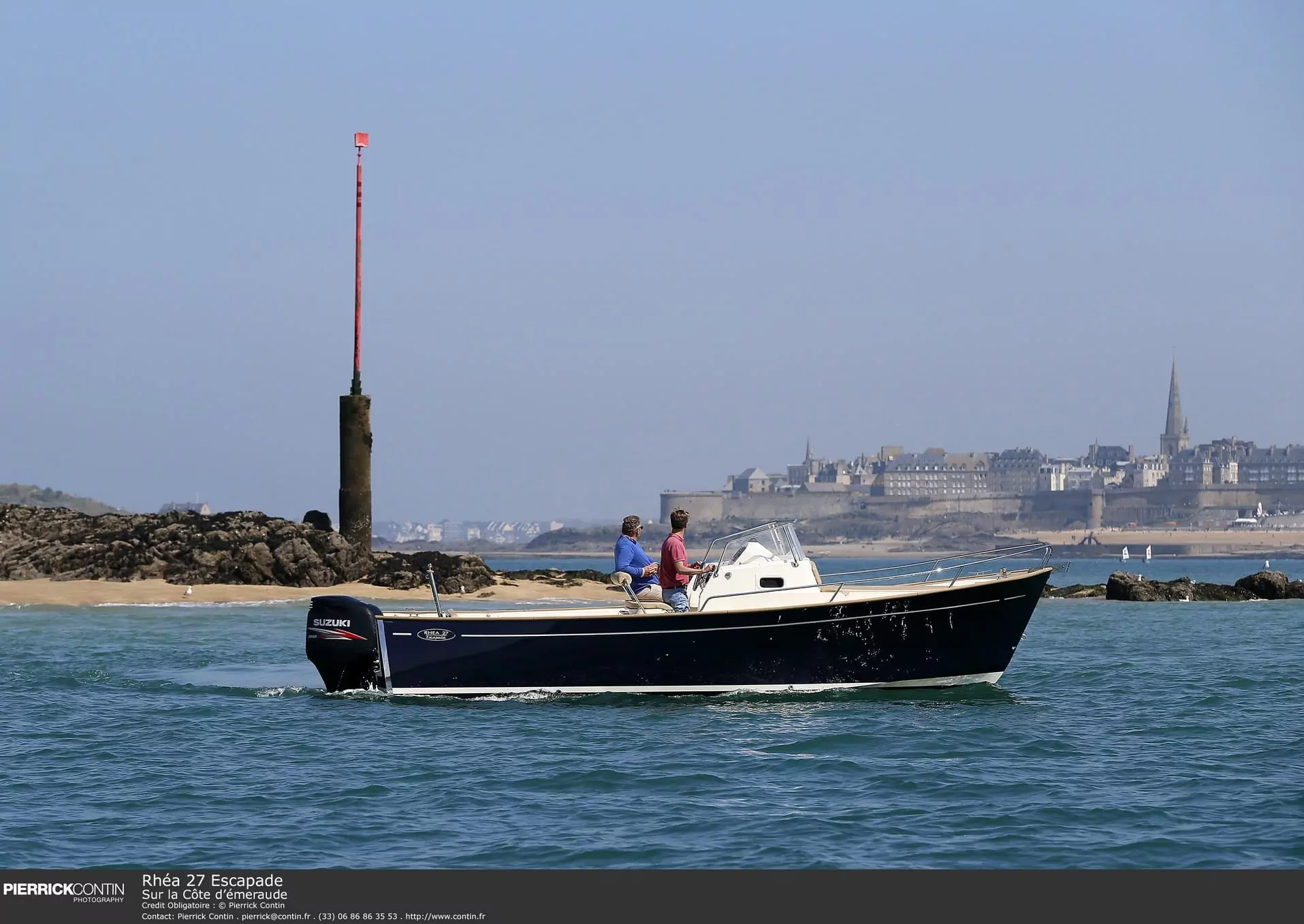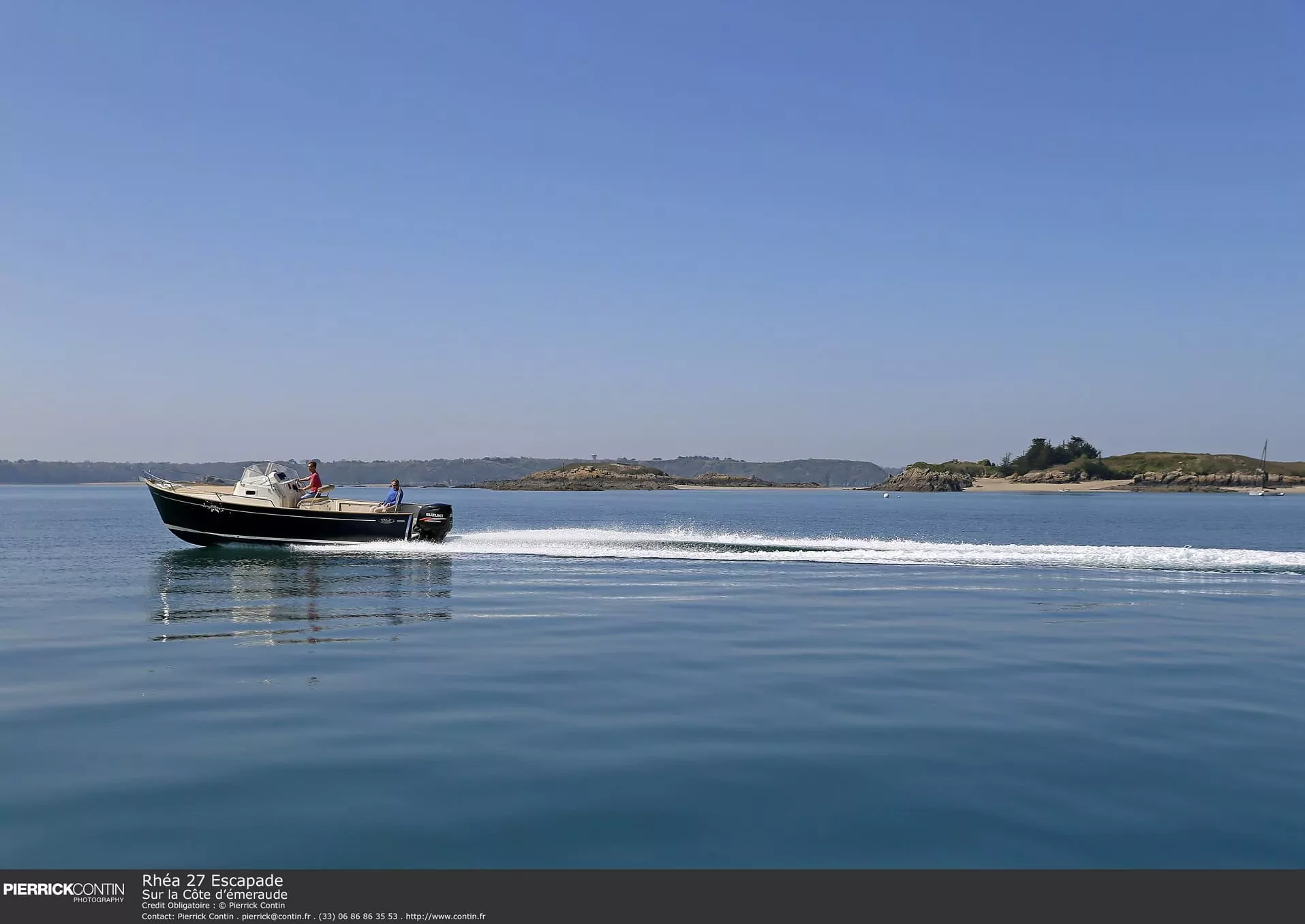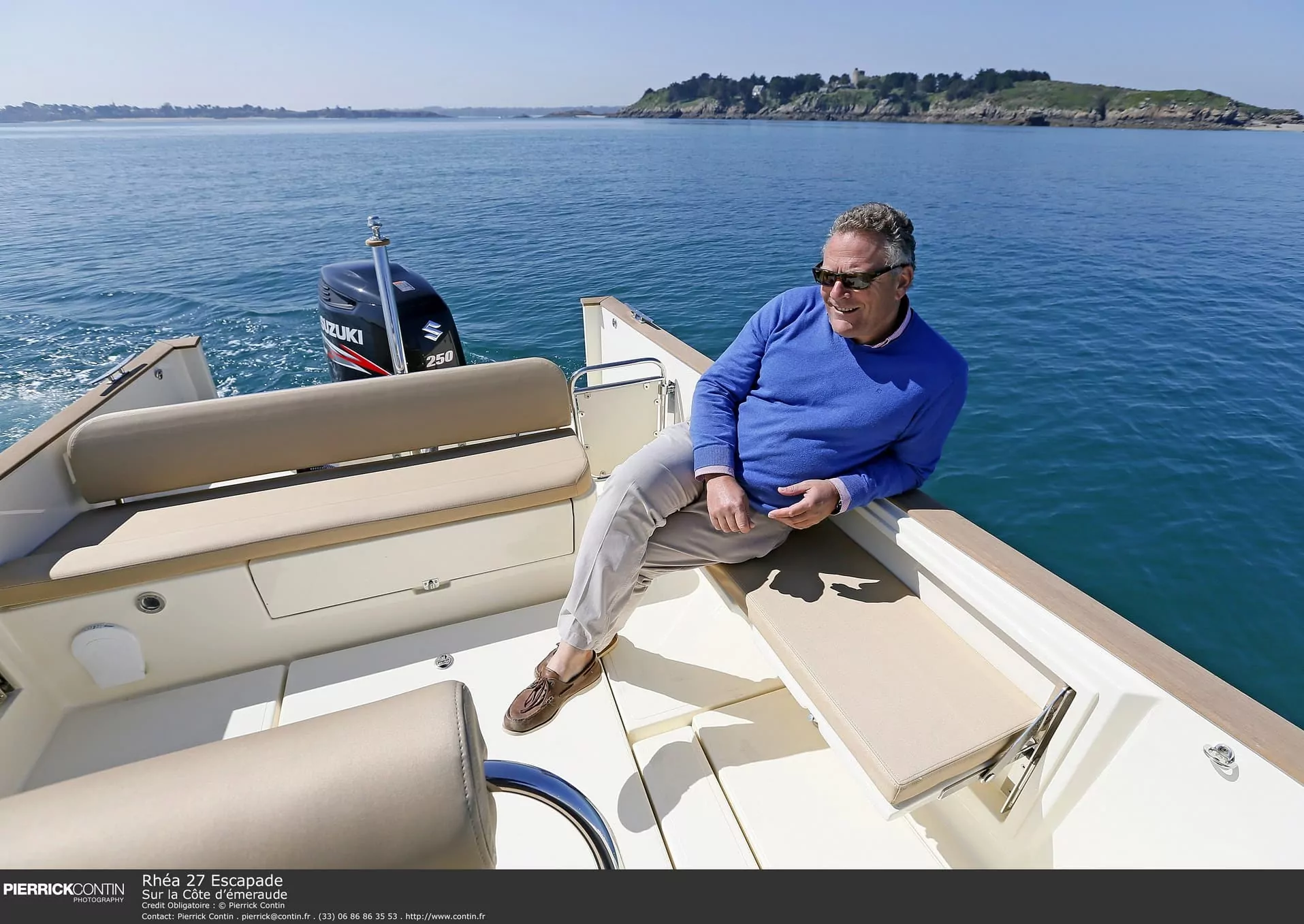 Le Rhéa 27 Escapade se prête à merveille aux navigations à la journée comme aux petites croisières, grâce à sa cabine équipée d’un lit double, d’une cuisine avec réfrigérateur et d’un cabinet de toilette digne de ce nom. La main courante inox autour du pare-brise et du siège pilote ajoutent à la sécurité du bord et à l’élégance du bateau.