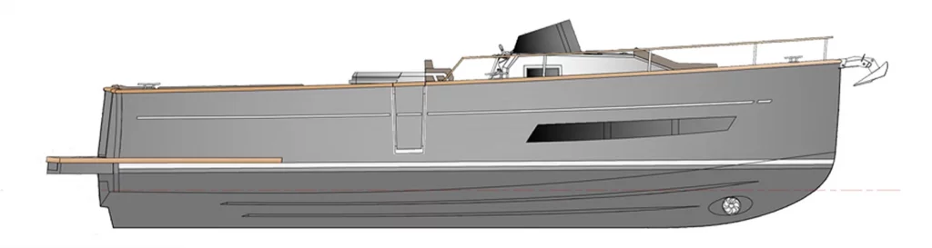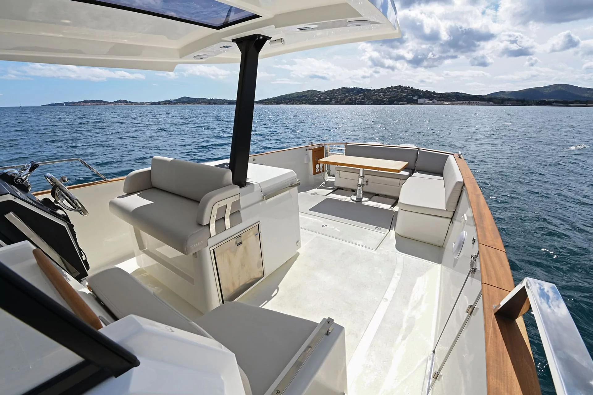 The self-bailing cockpit features the same layout with an L-shaped bench seat on the starboard aft end and the option to move the central module, mounted on rails, forward to raise the engine. A table can then be installed, creating a comfortable cockpit seating area.