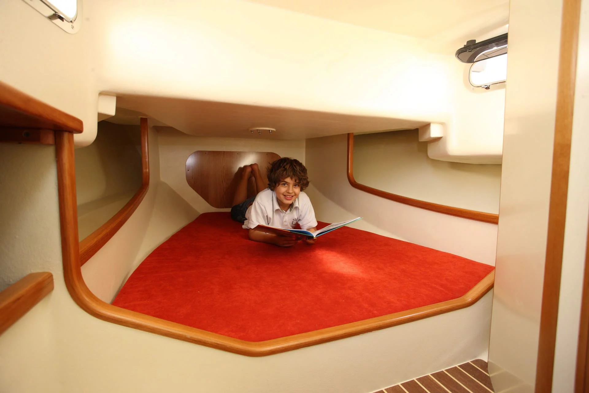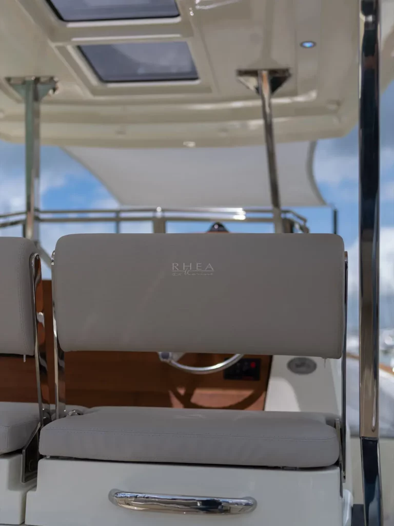 En plus de ce nouveau carré, la barre se trouve désormais à tribord, et la console est agrémentée d’une planche de bord du plus bel effet. Le 35 Open 2 possède également une cabine double et un cabinet de toilette bien pensé. Doté d’une très belle carène, réputée pour son passage en mer, le Rhéa 35 Open 2 se révèle être parfait parfait pour une croisière côtière à la journée, voire pour de petites croisières côtières.
