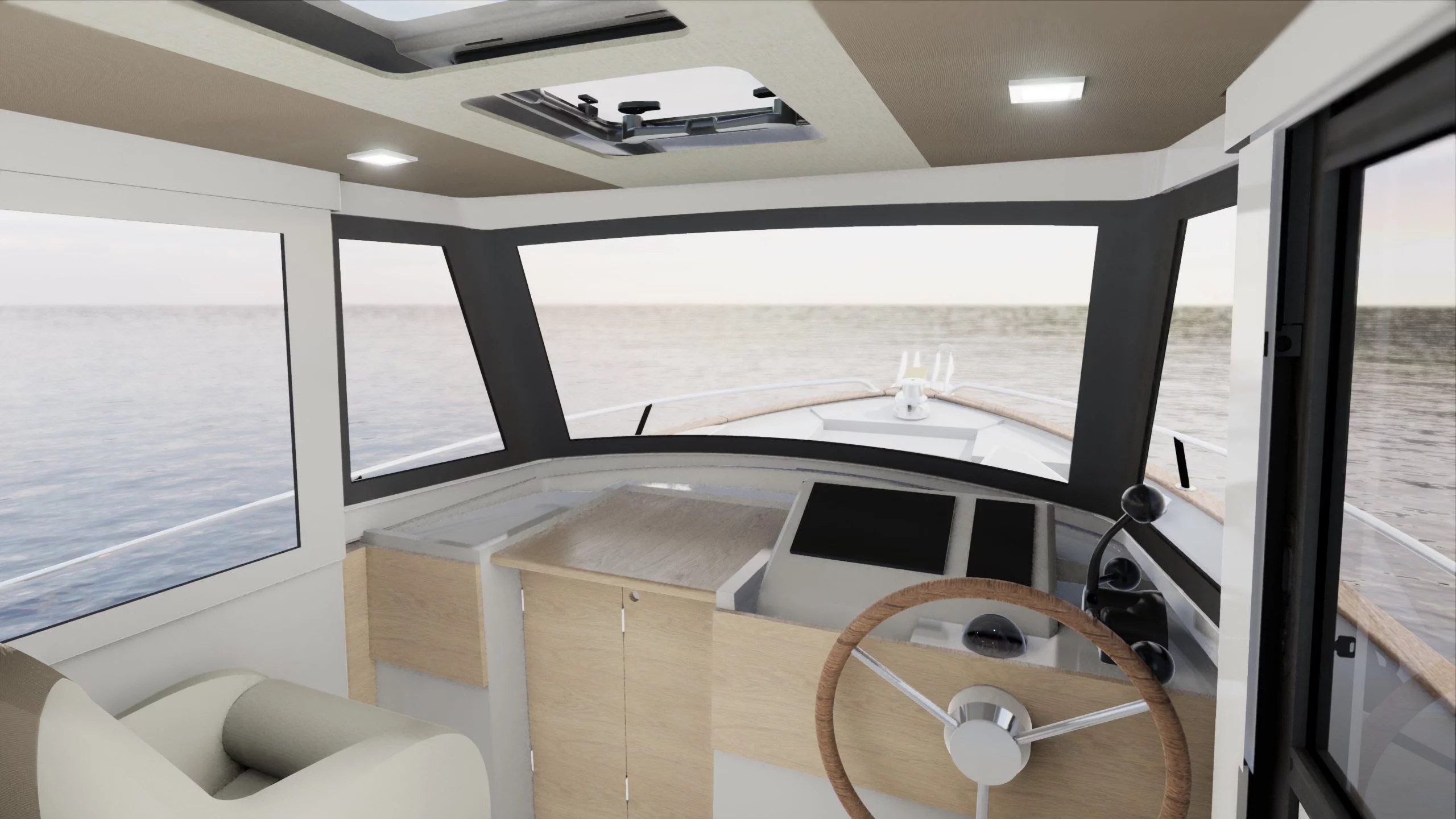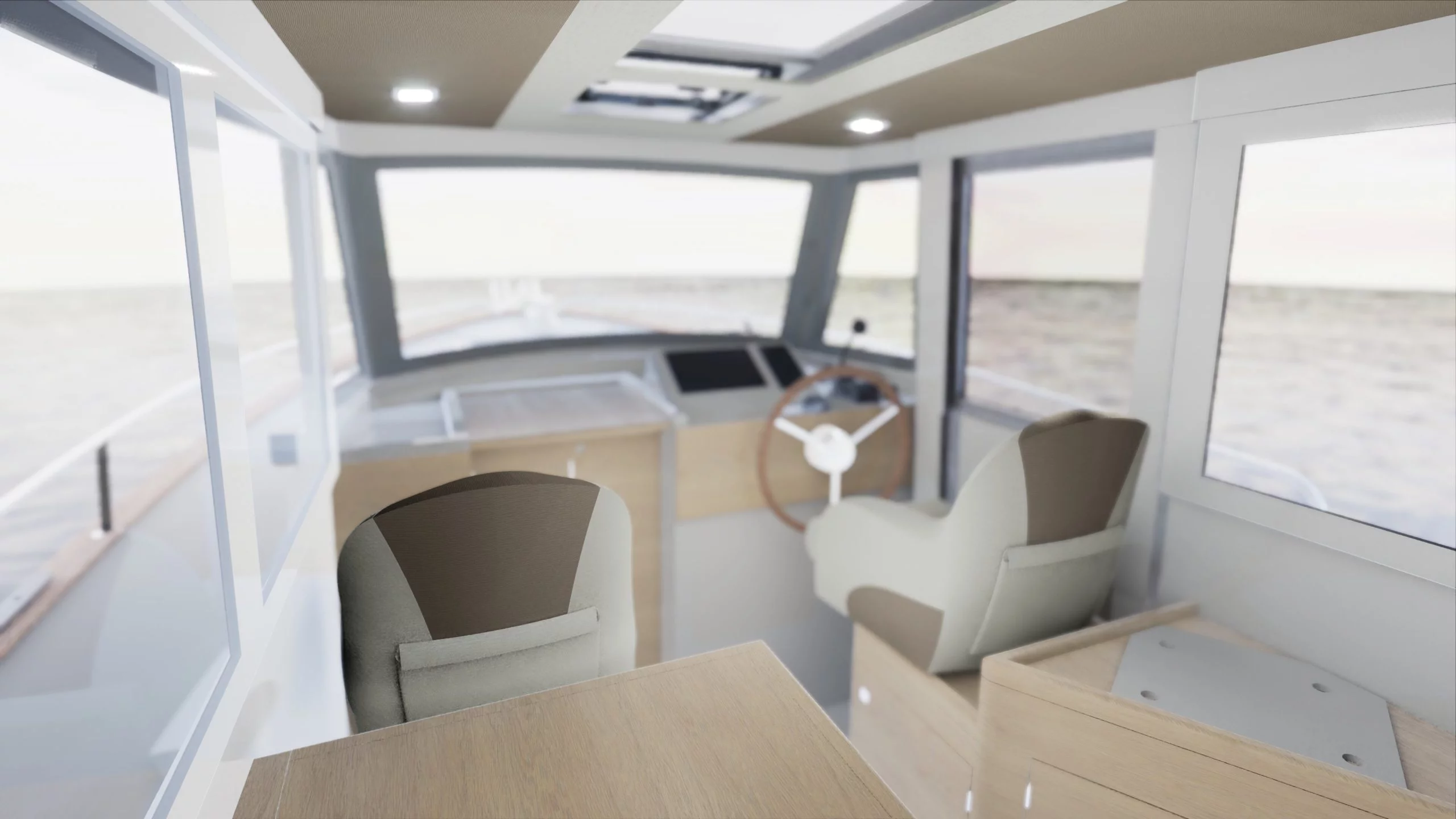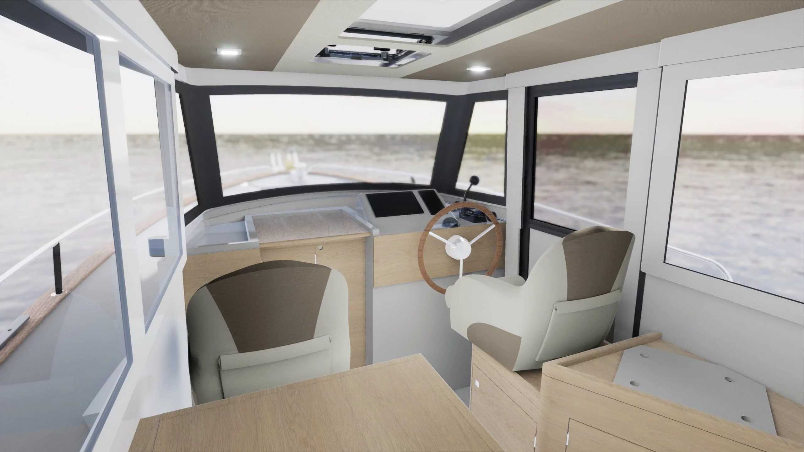 Intérieur en chêne clair massif. Une console rabaissée offrant une meilleure visibilité vers l’avant en rabaissant la console. Plafond vaigré bi-ton. Augmentation du nombre de points lumineux LEDS dans la timonerie ( 4 au lieu d’1 )