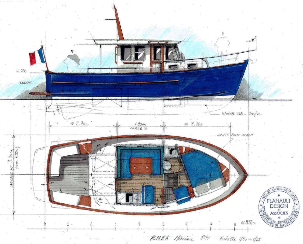 Bateau moteur chalutier, silhouette charmante de petit chalutier d’antan, même carène semi-planante gage d’une navigation fluide, ce « petit grand bateau » reprend les caractéristiques du Rhéa 800 mais en version XL, tout en restant très manœuvrable, même en solitaire.